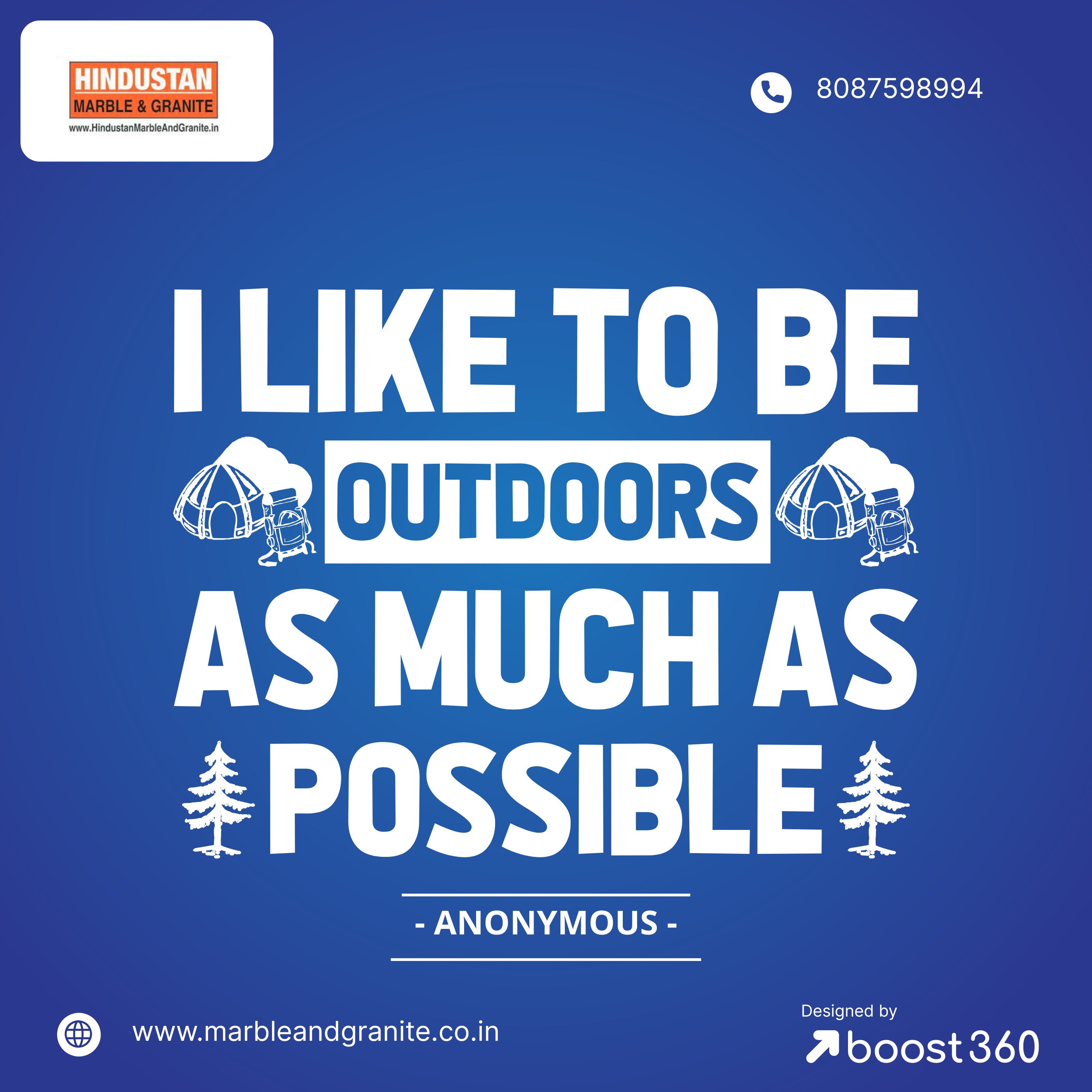 I like to be outdoors as much as possible - ANONYMOUS #inspirationalquotes #motivationalquotes #inspiration #motivation #quotes #quoteoftheday. #Best Marble and granite Dealer in Pune#